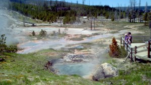 We said our goodbyes and ventured into Yellowstone. Our first stop was at the Steamboat Geyser Basin. Here we picked up another set of Junior Ranger workbooks (which are in a larger newspaper format). Right away we saw that one of the ranger programs required to get the official Yellowstone Junior Ranger Patch was about to start so the kids and I boogied down the boardwalk trails to the Steamboat Geyser where a very engaging ranger gave a crash course lesson on the geology of Yellowstone and the way the different geysers operate.